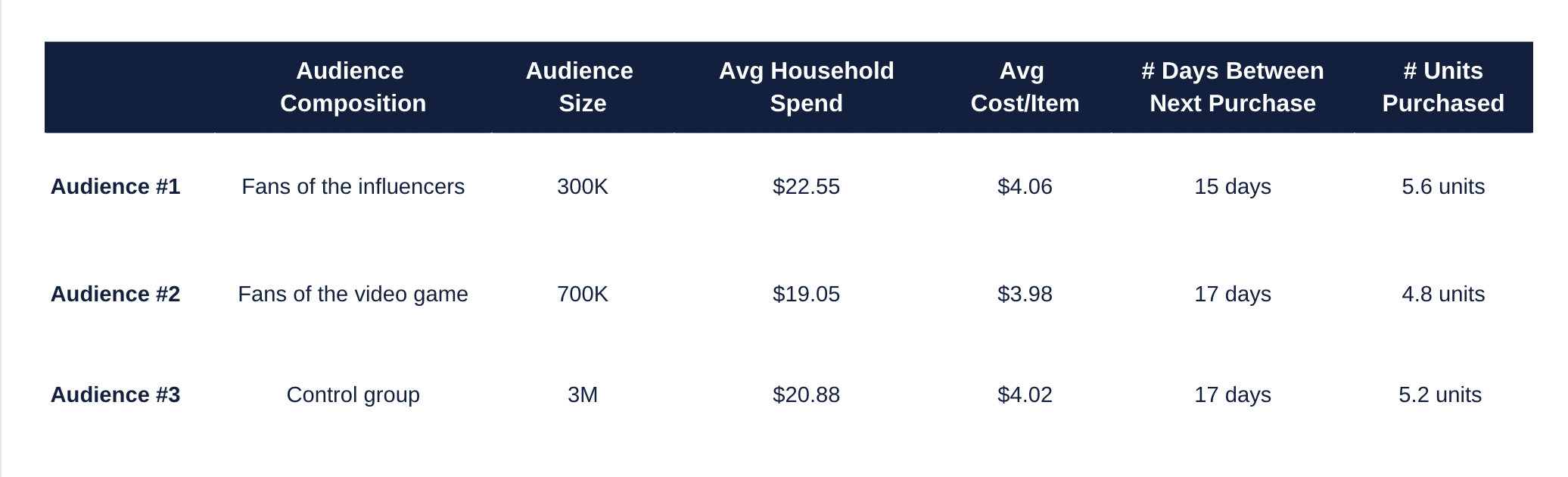 Step 3: Compare purchase behavior between the exposed and control audiences to determine resulting sales lift from your influencer partnership.
