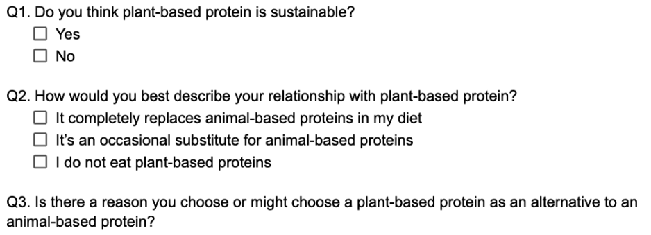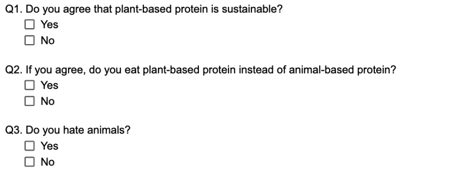 For fun, let’s look at just how easily a brief three question survey conducted by a plant-based protein company can turn from objective to bias: