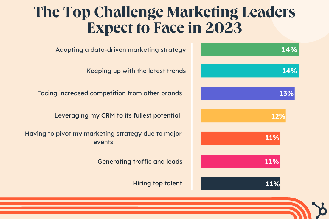 HubSpot polled marketing leaders to understand the top challenges they were facing in 2023. Among the top 5 pain points were adopting a data-driven marketing strategy, increased competition, and generating traffic and leads.