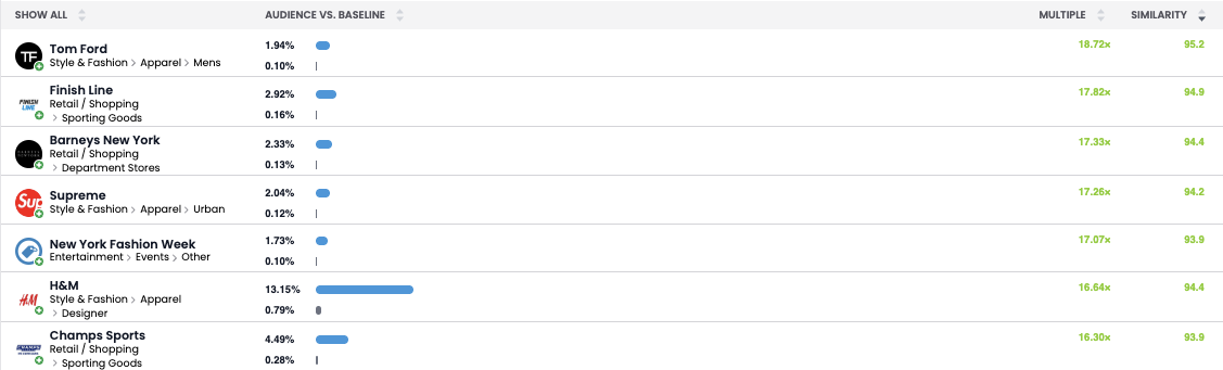 It should come as no surprise that the top brands for this audience are all about fashion, but we can also see this audience isn’t just about high end brands. They also show affinities for athletic clothing as well as more affordable brands like H&M.