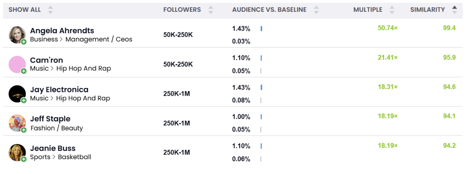 Looking at the Multiple, we can see that this audience is 50.74x more likely to engage with micro influencer Angela Ahrendts compared to the general population. This audience is also 99.4% similar to Angela’s social audience, indicating strong alignment.