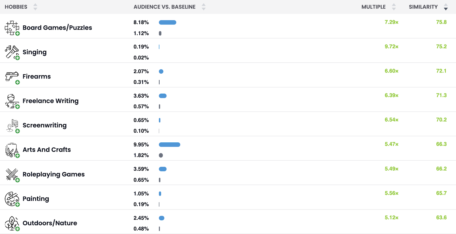 Knowing what an audience is interested in can help you better understand what motivates them. Taking a look at this audience’s top hobbies, we can see they show an interest in creative writing, board games, and various arts. These insights indicate this audience is highly creative and also appreciates nature and the outdoors. If a brand wanted to reach this audience, they would want to take these interests into consideration when crafting their messaging strategy for future campaigns.